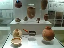 Although very rarely a complete vase, archaeology has resulted in pottery from the Dilmunite city of Qal'at al Bahrain being unearthed. There were two styles of pottery, "Barbar" and "Eastern." Sanctuaries would be filled with small figurines. Most of these figurines were of a bearded horseman holding a mount without reigns. Other figurines depicted hybrids between animals and people.[54] Inside ancient Dilmunite houses storage jars, painted pots, fine chisels, and copper have been found.[55]