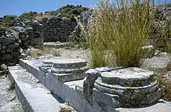 The ancient city consisted of a street almost 800 m long and especially wide for its time (between two and four meters) extending in a southeastern direction and containing several imposing buildings. A small cul-de-sac branches off at right angles and at its termination, high up on the mountainside, were the headquarters of a garrison stationed in the city. After about 200 meters of street the city expands to cover an area of about 100 x 100 meters on an exposed plateau high above the rocky coast. Residential areas are grouped around an agora, which is across from a theater built into the lower slope. Separated off and facing the sea at the eastern tip of the plateau is a small sacred area with temple grounds and public facilities. All buildings are constructed of the local limestone of the mountain itself. Wood was rare on the island and seldom used for building.