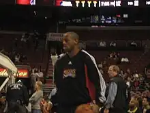Iguodala was selected 9th overall in the 2004 NBA draft by the Philadelphia 76ers. When Iguodala was selected, ESPN personality Dick Vitale commented that it was a mistake for the Sixers to take him, saying "Iguodala was a [27 percent] shooter from the college three-point line. He's not going to be able to play".[15] Iguodala used this as motivation in what proved to be a very productive rookie season.[16] Iguodala was thrust into the starting lineup immediately and was the only 76er to play and start all 82 regular-season games plus 5 playoff games, becoming a favorite target of Allen Iverson in the process, often connecting on highlight-reel dunks on passes or alley-oops from Iverson. Iguodala proved his versatility, as he was the only rookie and 76er to record a triple-double that season, doing it against the defending champion Detroit Pistons. In the game, he scored 10 points, caught 10 rebounds and dished out 10 assists. During the season, he averaged 9 points, 5.7 rebounds, 3 assists, 1.7 steals, and 32.8 minutes per game. His efforts were rewarded when he was named to the All-Rookie First Team and started on the rookie team during the Rookie Challenge portion of All-Star Weekend.[17][18] He finished fourth in voting for NBA Rookie of the Year.[19]