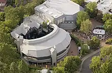 Aerial view of Elizabethan and Bowmer Theatres during a Green Show (see below)
