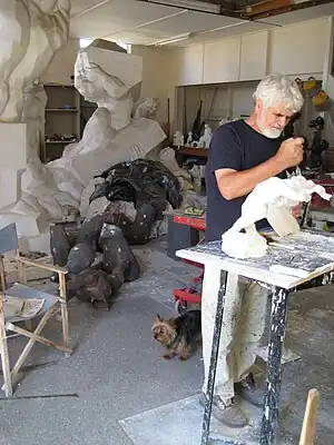 Ante Dabro at work in his studio at Canberra Airport, 2011. Behind (L-R) are the full sized models for "Genesis", "Resilience", the unassembled pieces of "Mother and Child", and his Australian Silky Terrier, Chico.