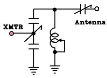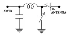 Many matching networks can match any impedance in principle, but note that any one transmatch as-built can only match impedances for which the ranges of inductance and capacitance of its installed parts are adequate.[21] - ↑ For example, multi-kilowatt AM stations often overload shortwave receivers within a few of miles of their tower, despite operating on a much lower frequency. In that case, attenuation of low frequencies would be an added benefit, and a high-pass network would be preferred for its side-effect of blocking medium frequencies if set to match on a shortwave frequency.