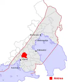 In 1940, Antrea became a part of newly established Yaskinsky District with the administrative center in the work settlement of Yaski. At the same time, it was granted town status.[2] At that time, it was a part of the Karelian ASSR (after March 30, 1940 of the Karelo-Finnish SSR).[12] On November 24, 1944, Yaskinsky District was transferred from Karelo-Finnish SSR to Leningrad Oblast.[13] To replace Finnish names of the localities with Russian names, on October 1, 1948, the district was renamed Lesogorsky and the town of Antrea was renamed Kamennogorsk.[13] The town's new name was due to the presence of crystalline deposit outcrops and a granite mine in the vicinity.[14] On December 9, 1960, Lesogorsky District was abolished and merged into Vyborgsky District.[13]