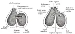 The aortic sac or aortic bulb[1] is a dilated structure in mammalian embryos, lined by endothelial cells and is the most distal part of the truncus arteriosus.[2] It is the primordial vascular channel from which the aortic arches arise (and eventually the dorsal aortae) and is homologous to the ventral aorta of gill-bearing vertebrates. The aortic sac eventually forms right and left horns, which subsequently give rise to the brachiocephalic trunk and the proximal segment of the arch of aorta, respectively.[2]