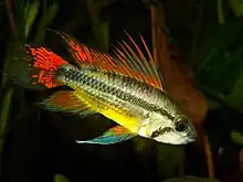 Apistogramma cacatuoides or the cockatoo dwarf cichlid is a South American cichlid and the Apistogramma species most commonly bred in captivity.