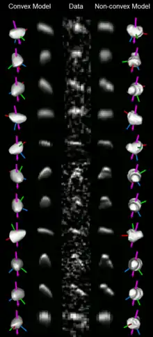 ![]() Model of 99942 Apophis's shape, assuming the entire surface is of a similar composition. | |