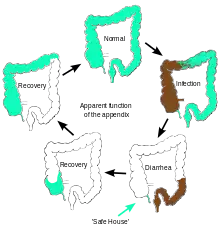 William Parker, Randy Bollinger, and colleagues at Duke University proposed in 2007 that the appendix serves as a haven for useful bacteria when illness flushes the bacteria from the rest of the intestines.[14][15] This proposition is based on an understanding that emerged by the early 2000s of how the immune system supports the growth of beneficial intestinal bacteria,[16][17] in combination with many well-known features of the appendix, including its architecture, its location just below the normal one-way flow of food and germs in the large intestine, and its association with copious amounts of immune tissue. Research performed at Winthrop–University Hospital showed that individuals without an appendix were four times as likely to have a recurrence of Clostridium difficile colitis.[18] The appendix, therefore, may act as a "safe house" for beneficial bacteria.[14] This reservoir of bacteria could then serve to repopulate the gut flora in the digestive system following a bout of dysentery or cholera or to boost it following a milder gastrointestinal illness.[15]