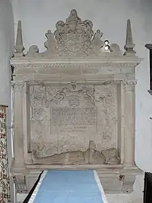 Monuments in the church include a brass of two shrouded corpses in memory of John Goudrington, who died in 1518, and his wife. In the chancel is a Renaissance stone monument erected in 1593 in memory of Sir John Fettiplace, who died in 1580. It includes a life-size effigy of Sir John in 16th-century armour, a pair of Corinthian columns supporting a canopy surmounted by a pair of obelisks, and a long Latin inscription surrounded by extensive strapwork and a number of skulls.[6][3]