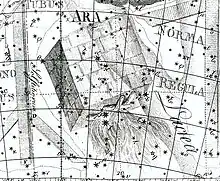 Bayer gave eight stars Bayer designations, labelling them Alpha through to Theta, though he had never seen the constellation directly as it never rises above the horizon in Germany. After charting the southern constellations, French astronomer Nicolas-Louis de Lacaille recharted the stars of Ara from Alpha though to Sigma, including three pairs of stars next to each other as Epsilon, Kappa and Nu.[14]