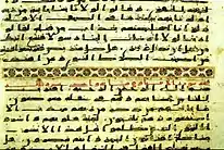 The Birmingham Quran manuscript is a parchment on which two leaves of an early Quranic manuscript are written. In 2015 the manuscript, which is held by the University of Birmingham,[15] was radiocarbon dated to between 568 and 645 CE (in the Islamic calendar, between 56 BH and 25 AH).[16][17] It is part of the Mingana Collection of Middle Eastern manuscripts, held by the university's Cadbury Research Library.[16] The manuscript is written in ink on parchment, using an Arabic Hijazi script and is still clearly legible.[17] The leaves preserve parts of Surahs 18 (Al-Kahf) to 20 (Taha).[18] It was on display at the University of Birmingham in 2015 and then at Birmingham Museum and Art Gallery until 5 August 2016.[19] The Cadbury Research Library has carried out multispectral analysis of the manuscript and XRF analysis of the inks.[20]