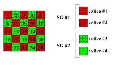Figure 3: An example of macroblock assignment to four slices and to two ''Slice'' Group (SG in the figure). Each slice is represented by a different texture, and each Slice Group is represented a different color.
