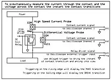 Electrical arcing across the contacts of an electromechanical relay may be effectively measured using an oscilloscope connected to a differential voltage probe across the relay contacts and a high speed current probe to measure the current through the contacts during operation under load.[14][15]