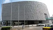 There were repeated efforts in the 20th century to address the booming population through large-scale urban developments and housing projects in various locations. A number of new satellite cities were founded around Cairo with this intention.[84] Newer public buildings and monuments also date from the second half of the 20th century after the 1952 revolution. In the 1950s President Gamal Abdel Nasser remodeled Tahrir Square, the symbolic heart of the capital. Next to the square, the new Arab League Headquarters was erected on the site of a demolished British army barracks.[98] The Cairo Tower, a 187-meter tall observation tower with a lotus-motif design, was built between 1955 and 1961[99] and designed by Egyptian architect Naoum Shebib.[100] It was the tallest all-concrete structure in the world upon completion[99] and it is the most recognizable symbol of post-1952 Egyptian architecture.[100] The Cairo Opera House, originally opened in 1869 under Khedive Isma'il and designed as an imitation of La Scala in Milan,[101] burned down in 1971. It was replaced by a new opera house and cultural complex begun in 1985 and opened in 1988, designed by a Japanese architectural firm.[84] In 1975, President Anwar Sadat opened the Unknown Soldier Memorial, designed in the shape of a hollow pyramid, in Cairo.[102] (Sadat was later buried here after his assassination.[103])