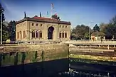 The Lake Washington Ship Canal and Ballard Locks (a.k.a. Hiram M. Chittenden Locks), opened in 1917, were funded by Washington state but built by the United States Army Corps of Engineers.[174] The Administration Building for the locks was designed by prominent Seattle architects Bebb and Gould and completed 1916. The Renaissance Revival style building is a relatively early example of concrete construction, but also makes use of materials such as marble and oak; the light globes at the south entrance are supported by bronze sculptured dolphins. Under the building, in a series of basements, an extensive complex of pumps is used annually to empty the locks for cleaning.[175] Another prominent building at the Locks is Cavanaugh House (1913), nestled in the Carl English Jr. Gardens. Originally intended as a home for an electrician to be handy to the locks, but since 1967 the official residence of the Chief Engineer of the Corps of Engineers Seattle District. It was the first completed structure of the Ship Canal project; the architect is unknown.[176]