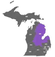 Area code 989 is a telephone area code in the North American Numbering Plan for Central Michigan, the northeastern Lower Peninsula, and portions of the Thumb. It is the highest-numbered area code in use in the North American Numbering Plan (NANP),[1] as well as the highest possible under the current system, in which a middle digit of 9 is forbidden.