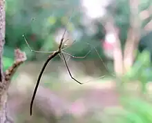 They are long and thin, often resembling a twig. The body length of males is 13 millimetres (0.51 in) and females is 22 mm (0.87 in). Body colour varies from cream, brown or greenish. They are often being found around a metre above the ground, resembling a twig caught in a spider's web.