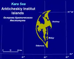 The Arkticheskiy Institut Islands or Arctic Institute Islands (Russian: Острова Арктического института) is a compact archipelago of narrow islands covered with tundra vegetation. The islands are located in the Kara Sea, about 173 km (107 mi) north of the coast of Siberia, and just 45 km (28 mi) south of the nearest island group, the Izvesti Tsik Islands.