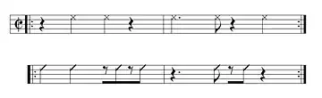 When clave is written in two measures, as shown above, the measure with three strokes is referred to as the three-side, and the measure with two strokes—the two-side. When the chord progression begins on the three-side, the song, or phrase is said to be in 3-2 clave. When it begins on the two-side, it's in 2-3 clave.[17] The 2-3 bass line of "Dame un cachito pa' huele" (1946) coincides with the three-side of the clave's five-note pattern.[18][19] David García identifies the accents of "and-of-two" (in cut-time) on the three-side, and the "and-of-four" (in cut-time) on the two-side of the clave, as crucial contributions of Rodríguez's music.[20] The two offbeats are present in the following 2-3 bass line from Rodríguez's "Mi chinita me botó" (1944).[21]
