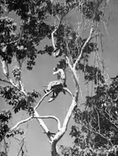 A U.S. Marine artillery forward observer in a tree to get a better view of the battlefield in Guadalcanal, 1942.
