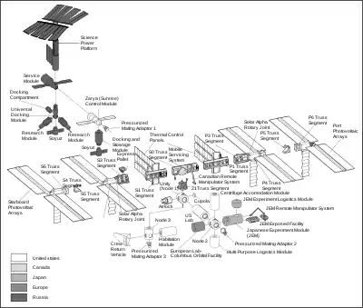 The ISS, when completed, will consist of a set of communicating pressurized modules connected to a truss, on which four large pairs of photovoltaic modules (solar panels) are attached. The pressurized modules and the truss are perpendicular: the truss spanning from starboard to port and the habitable zone extending on the aft-forward axis. Although during the construction the station attitude may vary, when all four photovoltaic modules are in their definitive position the aft-forward axis will be parallel to the velocity vector.[6]