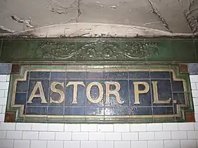 The walls in this station contain modern enamel artwork. The walls along the platforms near the fare control areas consist of a brick wainscoting on the lowest part of the wall, with bronze air vents along the wainscoting, and white glass tiles above. The platform walls are divided at 15-foot (4.6 m) intervals by buff brick tile pilasters, or vertical bands; the wall sections between each pilaster contain a border of blue mosaic tiles. In the original portion of the station, each pilaster is topped by yellow faience plaques depicting beavers, surrounded by green scrolled and foliate motifs. The beaver plaques are a reference to John Jacob Astor, whose fortune had been derived from the beaver-pelt trade.[2]:4–5[6]:8 A faience cornice with green urn and vine motifs runs atop these walls.[2]:4–5[6]:8 Cream-on-blue faience plaques with the words "Astor Place" are also spaced at various intervals on the walls, a deviation from the tile plaques seen at other original IRT stations. The platform extensions contain similar decorative elements, but the pilasters are made of tan ceramic tiles, and the wall sections between each pilaster contain a border of blue ceramic tiles. Within the platform extensions' pilasters are tiled plaques with the vertical text "Astor".[2]:5[44]:82 There were maroon and gold tile Cooper Union signs underneath the tile Astor Place signs, which were destroyed during the renovation.[64] The mosaic tiles at all original IRT stations were manufactured by the American Encaustic Tile Company, which subcontracted the installations at each station.[60]:31 The decorative work was performed by tile contractor Manhattan Glass Tile Company and faience contractor Grueby Faience Company.[60]:33