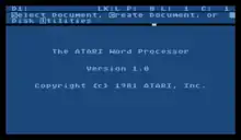 Atari Word Processor is a word processor program for the Atari 8-bit family, announced by Atari, Inc. in January 1981 and shipped that summer. The program was powerful for its era, including numerous features like superscripts and two-column layouts. It was also quite complex, with a long list of control keys for basic operations and text-based menus for more complex ones. It left little memory free after loading, so longer documents had to be stored as separate files of about a page each and printing demanded a long re-formatting process as they were stitched together.