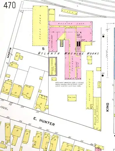 The Atlanta Machine Works was early Atlanta's first foundry and metal fabrication company. in 1848, Austin Leyden together with Robert Findlay and others established a foundry, amassed a fortune and eventually sold the company, called A. Leyden & Co., in 1853 to a business partner. Thereafter it became known as the Atlanta Machine Works and went on to play a central role in the Civil War, producing weaponry and other goods for the Confederacy. The foundry was located at the northwest corner of Hunter (now Martin Luther King, Jr. Blvd.) and King streets,[1][2] now occupied by a larger industrial site only 495 metres (1,624 ft) from the Georgia State Capitol.