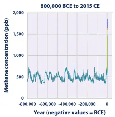 This 2016 EPA illustration above is a compilation of paleoclimatology showing methane concentrations over time based on analysis of gas bubbles from[75] EPICA Dome C, Antarcticaapproximately 797,446 BCE to 1937 CE,[76] Law Dome, Antarcticaapproximately 1008 CE to 1980 CE[77] Cape Grim, Australia1985 CE to 2015 CE[78] Mauna Loa, Hawaii1984 CE to 2015 CE[79] and Shetland Islands, Scotland: 1993 CE to 2001 CE[80]
