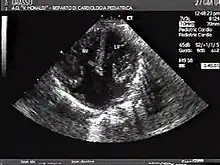 This is an echocardiography of a complete atrioventricular canal defect. There is a clear absence of the lower septum that would separate all four chambers of the heart.