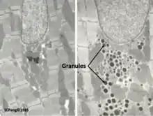Electron micrograph of ventricular (left) and atrial myocyte (right) showing location of ANP storage granules in a mouse model. Captured by Dr. Stephen C. Pang from Queen's University.
