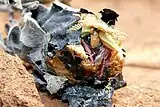 After approximately two weeks, dusty-green caterpillars hatch and feed on their egg-shell, and then the foliage of citrus, cinnamon, guava, and evergreen trees.[6] The caterpillars can grow to 11.5 cm (4.5 in) in length and 2.5 cm (0.98 in) in thickness. They have white, waxy, fleshy spines along their backs, which become more prominent at later instars. On the last abdominal segment beside the prolegs, there is a large green spot surrounded by an orange ring.[7]