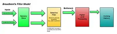 Donald Broadbent's filter model is the earliest bottleneck theory of attention and served as a foundation for which Anne Treisman would later build her model of attenuation upon.[9] Broadbent proposed the idea that the mind could only work with so much sensory input at any given time, and as a result, there must be a filter that allows us to selectively attend to things while blocking others out. It was posited that this filter preceded pattern recognition of stimuli, and that attention dictated what information reached the pattern recognition stage by controlling whether or not inputs were filtered out.[4]