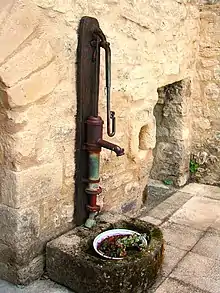 The soils of the commune are formed on a substrate which is mainly limestone: this limestone is also used to roof the housing.[6] The village is however located on a hill of red marl of the Oligocene period and has yielded bones of large mammals and reptiles (crocodile and turtle). In the Aiguebelle valley (a stream that never runs dry even in the most severe droughts) fossils of plants and fish (Smerdi macrurus) have also been found. The areas of both deposits are classified as geological reserves (included in the Natural Geological Reserve of Luberon) and collecting of fossils is prohibited. Information panels are placed close by. A selection of fossils from there can be seen at the Vachères Museum,[7] at the Natural Regional Park of Luberon Maison du Parc[8] in Apt (Vaucluse), and the National Museum of Natural History in Paris (Jardin des Plantes).