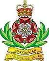 The AUSTINT badge was modelled on the British Army Intelligence Corps badge and accepted in 1953.[4] It has the motif of a white and red Tudor rose which is flanked by laurel leaves and rests on a scroll inscribed with "Australian Intelligence Corps". A crown surmounts the whole motif. The Rose symbolises security, confidentiality and trustworthiness, derived from the Cromwellian use of a rose displayed to indicate when secret matters were being discussed. The laurel wreath depicts honour and the crown represents allegiance to the Sovereign.