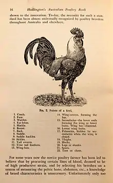 In the 1940s and earlier, other publications in Australia about poultry, such as Hadlingtons,[4] did have some parts devoted to aspects of showing birds, were less oriented towards show standards, and more detailed about general management of poultry, in line with his earliest publication.[5]