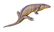 Axitectum is an extinct genus of bystrowianid reptiliomorph from lower Triassic deposits of Nizhni Novgorod and Kirov Regions, Russia. It was a rather large animal judging by the size of its vertebrae. The back was covered in bands of highly ornamented osteoderm plates, similar to those found in modern crocodiles. The bands overlapped with the next band at the posterior end.[1]