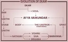 The mythical narrative speaks of Sivam (matter) and Shakti (energy) as the next evolved powers from the supreme Ekam. Then the Three lesser God-heads (i.e., Trimurthi) which are Sivan, Vethan and Thirumal evolved from this Shakthi. It also speaks of several further evolved lesser Gods. But in Kali Yukam, due to the cruel nature of the boons offered to Kaliyan, Thirumal (the then supreme power) cannot destroy the sixth fragment of Kroni directly so all God-heads were unified into the Ekam, and Ekam Incarnated in the world as a Turine god (Ekam, Narayana and Human) in the form of Vaikundar to overcome the boons and to destroy Kali. Since all were unified in Vaikundar, in Kali Yukam Vaikundar he was the Supreme Power and he was the only worshipable God. So in this regard Ayyavazhi is also viewed as a monotheistic religion.[1]