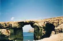 The Azure Window (Maltese: it-Tieqa Żerqa), also known as the Dwejra Window (Maltese: it-Tieqa tad-Dwejra), was a 28-metre-tall (92 ft) natural arch on the island of Gozo, located just off the shores of Malta. The limestone feature, which was in Dwejra Bay close to the Inland Sea and Fungus Rock, was one of the island's major tourist attractions until it collapsed in stormy weather on 8 March 2017. The arch, together with other natural features in the area, has appeared in a number of international films and media productions.