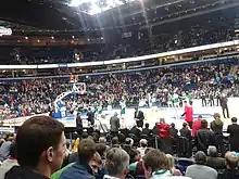 For the 2012–13 season, Žalgiris signed Lithuanian national team players Rimantas Kaukėnas, Darjuš Lavrinovič and Kšyštof Lavrinovič; Unicaja Malaga star Tremmell Darden; and point guard Oliver Lafayette.[48][49][50] The season began with Žalgiris winning the newly established LKF SuperCup against Lietuvos Rytas. Early in the season, Mantas Kalnietis left the team and was replaced by Ibrahim Jaaber. Under new coach Joan Plaza, Žalgiris had their best EuroLeague start with five consecutive wins. They finished at the top of their group for the first time in 13 years, with an 8–2 record. In their 76–66 home victory against CSKA Moscow, Žalgiris broke their attendance record, with 15,812 spectators.[51] In January 2013, Jaaber departed from the team due to personal reasons and was replaced by Donnie McGrath in February. In the coming months, financial troubles returned to the club, which led to the departure of Darden. The crisis coincided with the ongoing collapse of Ūkio Bankas. The bank's main shareholder Vladimir Romanov, who also owned the majority of shares of Žalgiris and was the club's president, abruptly left the country and flew to Russia in early March 2013, abandoning his stake in the club. On 20 March 2013, vice president Paulius Motiejūnas was named the team director. Despite the financial and management struggles, Žalgiris finished the top 16 stage with a 6–8 record, the best in club history, but narrowly missed the playoffs. Žalgiris also won the group stage in the VTB United League. In May, Žalgiris won their third straight LKL title, sweeping Lietuvos Rytas 4–0 in the finals.[52] After winning the LKL title, Žalgiris competed in the VTB United League playoffs, defeating Nizhny Novgorod in the quarterfinals but losing to Lokomotiv Kuban in the semi-finals. Despite the loss, Žalgiris was awarded the bronze medal for the first time since 2010.[53]