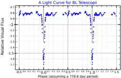 BL Telescopii is a multiple star in the constellation Telescopium.[2] An Algol-like eclipsing binary, the star system varies between apparent magnitudes 7.09 and 9.08 in just over 778 days (2 years 48 days),[3] which is generally too faint to be seen with the unaided eye.[7] This is mainly due to the system being an eclipsing binary (that is, one star passing in front of the other star and resulting in a change in brightness). The eclipse itself dims the star by two magnitudes and lasts around 104 days.[6]