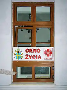 A baby hatch or baby box[1] is a place where people (typically mothers) can bring babies, usually newborn, and abandon them anonymously in a safe place to be found and cared for. This kind of arrangement was common in the Middle Ages and in the 18th and 19th centuries, when the device was known as a foundling wheel. Foundling wheels were taken out of use in the late 19th century, but a modern form, the baby hatch, began to be introduced again from 1952[2] and since 2000 has come into use in many countries, most notably in Pakistan where there are more than 300. They can also be found in Germany, where there are around 100,[3] Czech Republic (76) and Poland (67).[2]