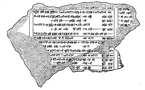 A fragmentary inscription dating to the Early Dynastic Period, likely in the Akkadian language, refers to an unknown lord who was the governor (ENSI) of BAR.KI.BAR and constructed the temple for Marduk, indicating that the city could very well be Babylon.[21] During the ED III period, sign placement was relatively fluid and so the KI sign could be seen as the determinative, with the name of the city as BAR.BAR, perhaps pronounced Babbar.[22] Paul-Alain Beaulieu proposes that the original name could mean "shining" "glowing" or "white". It would be likely that it was later read as Babbir, and then Babbil by swapping the consonant r with l.[21] The earliest unambiguous mention to the city Babylon came from one of Shar-Kali-Sharri's year names, spelled as KA.DINGIR.KI,[19] indicating that the folk etymology was already widely known in the Sargonic period. However, the original form of the name (Babbar/Babbir) was not forgotten, as seen from the phonetic spelling ba-ab-bí-lum in the Ur III period,[23] and the spellings Pambalu and Babalu in the Kassite period.[22]