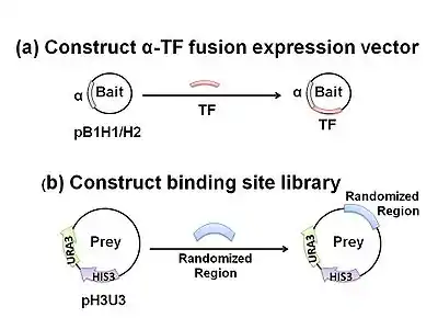 Transformation of a bacterial host with two different plasmids is required. One is designed to express a DNA-binding protein-of-interest as a fusion construct with a subunit of RNA polymerase (bait). The other plasmid contains a region of randomized sequence representing potential binding sites (prey) which, if bound to by the chimeric fusion product, drives expression of downstream reporter genes. This reporter region facilitates both positive and negative selection by HIS3 and URA3, respectively, which together allow for isolation of the prey containing the true DNA target sequence. HIS3 and URA3 encode proteins required for biosynthesis of histidine and uracil.