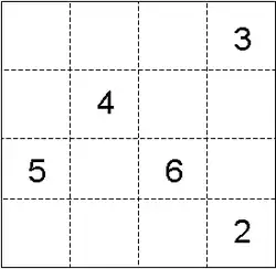 Bag is played on a rectangular grid, usually of dashed lines, in which numbers appear in some of the cells.