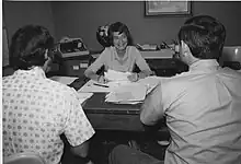 Barbara Crawford Johnson speaks to co-workers in her office, circa 1970-1974.