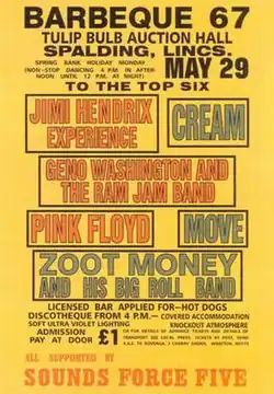 Towards the end of 1966, Grantham promoter, former footballer Brian Thompson,[2] set about booking Geno Washington and the Ram Jam Band and The Move. Their management persuaded Thompson to also book three relatively unknown acts at that time, being Pink Floyd, The Jimi Hendrix Experience and Cream.[1] The event was held in Spalding at the tulip bulb auction hall, most likely the largest building in the area that could hold a large crowd. In addition, Zoot Money's Big Roll Band were booked along with a local covers outfit, Sounds Force 5, who were booked to ensure a decent turnout and were to perform in all changeovers between each band at the side of the stage. Advertising was national and massively underestimated, with thousands making their way to the market town causing national radio to warn travellers to turn back. Attendance numbers have been estimated with a venue capacity of 6,000 and twice as many unable to gain entry.[3] Tickets cost just £1 and covered accommodation came in the form of the Spalding Town F.C. stand next door.[4]