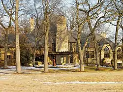 In 1921, the Barrington Hills Country Club, with its eighteen-hole golf course, was established on 200 acres (81 ha) of unfarmable land between County Line Road, Oak Knoll Road, and Northwest Highway. The land was donated by three of the club's early founders: H. Stillson Hart, who owned the farmstead known as Hart Hills just to the east of the club; George E. Van Hagen of Wakefield Farm, who owned the land just to the west of the club; and J.R. Cardwell, whose Oak Knoll Farm swelled along the winding Oak Knoll Road on the club's northern end. Van Hagen became the club's first president. Noted Chicago architect Robert Work, who was associated with David Adler, designed the first clubhouse, which was opened in 1926 and burned to the ground in 1930. Work designed the second clubhouse as well, which opened in 1931 and still stands.[8]