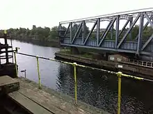 The structure is adjacent to, and upstream of, the Barton Road Swing Bridge. Both bridges are operated from a brick control tower on an island in the centre of the ship canal. When in the open position, the aqueduct and road bridge line up along the length of the island, allowing ships to traverse each side.[7][11] To avoid the risk of collision, the aqueduct is opened half an hour before traffic on the Manchester Ship Canal is scheduled to pass.[12]