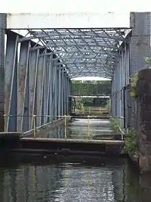 The Barton Swing Aqueduct is a direct replacement for the earlier Barton Aqueduct, a masonry structure crossing the river Irwell and completed in 1761. The construction of the Manchester Ship Canal in the 1890s necessitated the replacement of this structure, as the height of ships using the new ship canal was too great to pass under the old aqueduct.[6] An alternative scheme involving the use of a double lock flight was rejected, because of the need to conserve water in the Bridgewater Canal above.[7]