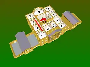 The first floor was designed to be a piano nobile (meaning literally a "noble floor"); as its name suggests, it contains the principal rooms of the house. During the 1770s, when Basildon was built, a domestic and architectural movement from formality towards informality was in progress. Thus, while the exterior of Basildon is pure symmetry, this symmetry is not reflected in the interior layout of the rooms as would have been the case just a few years earlier.[32] In any case, the builder of Basildon was not eminent enough to require a suite of state apartments on the piano nobile in permanent expectation of a royal visit. Thus, in keeping with this newly found spirit of informality Basildon has no formal and symmetrical enfilade of rooms of increasing splendour, but two separate first floor suites, one feminine and one masculine, were placed on either side of the hall. The library (10 on plan), considered a masculine room, was placed next to the owner Sir Francis Sykes' dressing room (9) while on the opposite side of the hall (11 and 12) were the bedroom and dressing room of Lady Sykes.[33] Sir Francis appears not to have had a bedroom on this floor, an arrangement not uncommon in the 18th century, when a dressing room served as a study and reception room combined—the owner would descend from his bedroom above to the dressing room and receive business callers while the finishing touches were made to his dressing by a servant.[30] Lady Sykes' dressing room or boudoir (11 on first floor plan), also used as private sitting room by the late Lady Iliffe, is now known as the Sutherland Room; it is currently used to display some of the studies by the 20th-century artist Graham Sutherland for his tapestry "Christ in Glory" at Coventry Cathedral.[34]